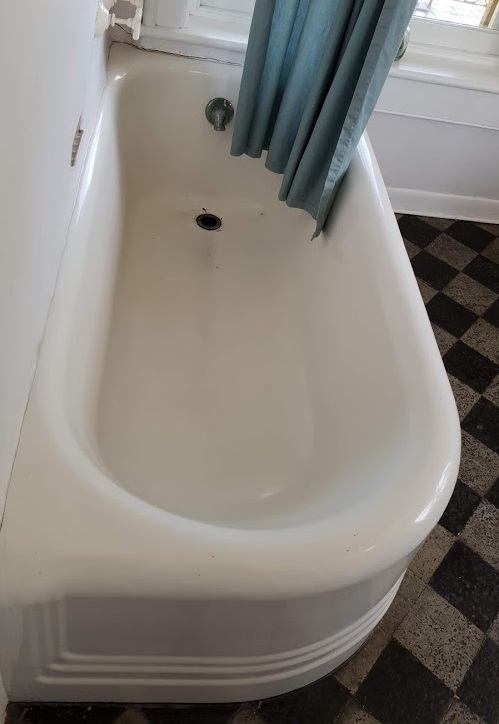 A kisebb fürdőszobában a fehér szín dominál mind a szaniterek, mind a fal esetében. A padlólap ez esetben világos és sötétebb színű cementlap, mely az akkoriban megszokott módon került lerakása, sakktáblára emlékeztető mintával.