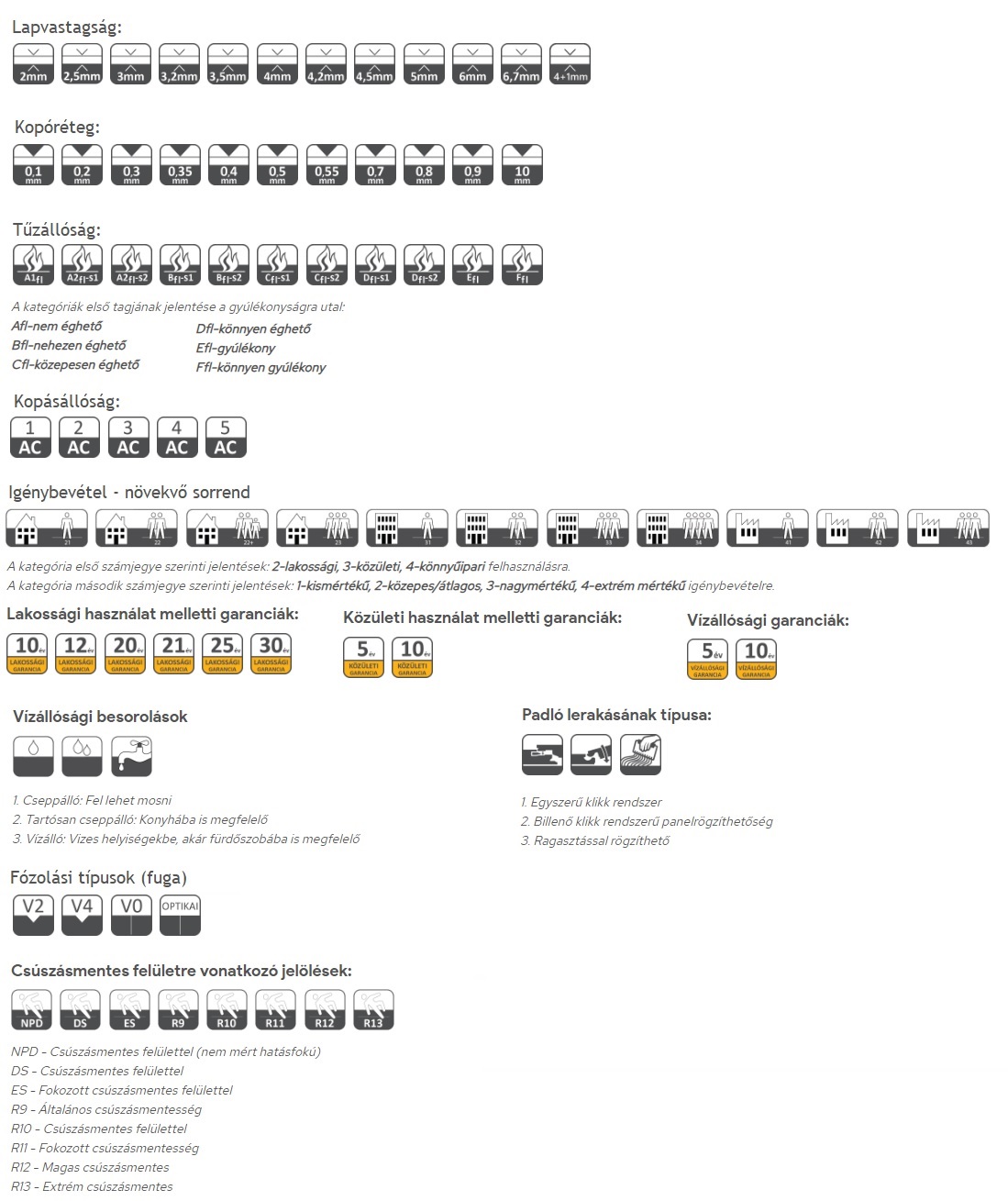 A jó építőanyagok felismerése tájékozottságot kíván. Nem árt tehát, ha van egy olyan jelrendszer, mely megkönnyíti az eligazodást a számunkra is fontos építőanyagok útvesztőjében. Ez a laminált padlólapok esetében is rendelkezésünkre áll, így egy pillantással tájékozódhatunk adottságaikról.