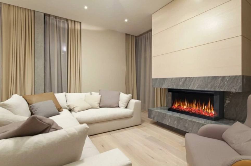 Modern design, látványos hatás: A letisztult formák, üvegfelületek és fémhatások révén a kandalló nemcsak fűt, hanem látványos központi elemmé is válik.