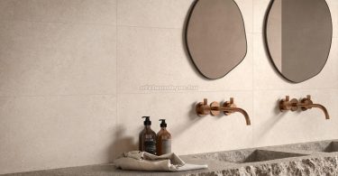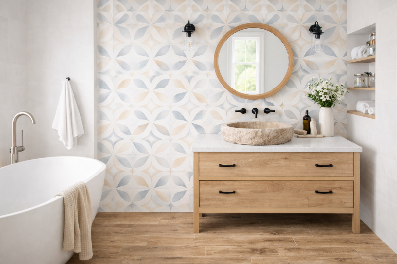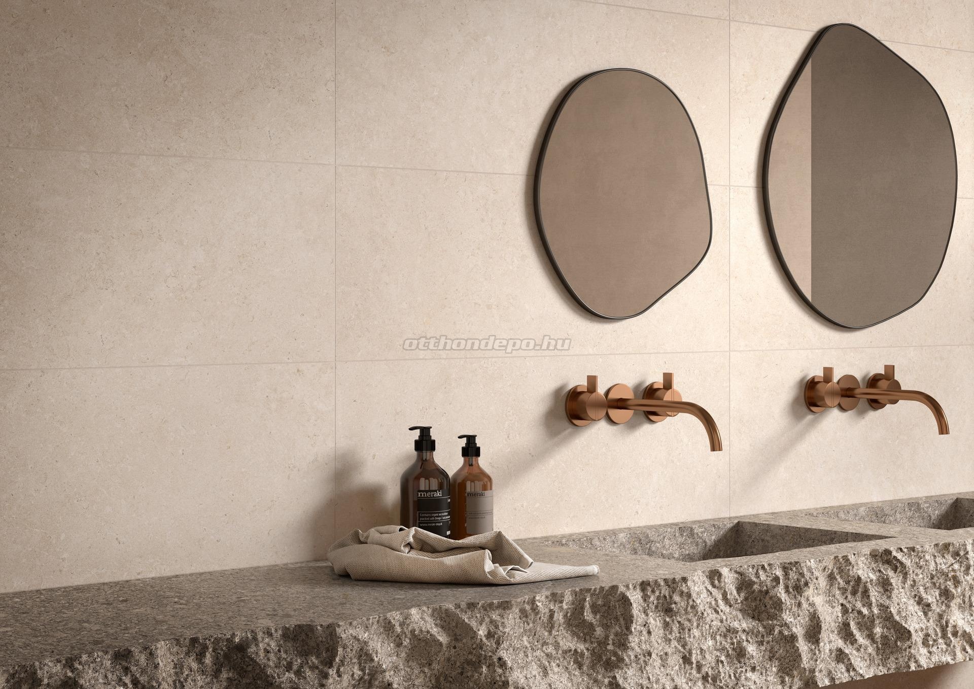 Design trend: A természetes kő és a fa hatású burkolatok a természetközeli (biophil) design alapjai, ami segít a fürdőszobát egy nyugodt, fenntartható oázissá varázsolni.