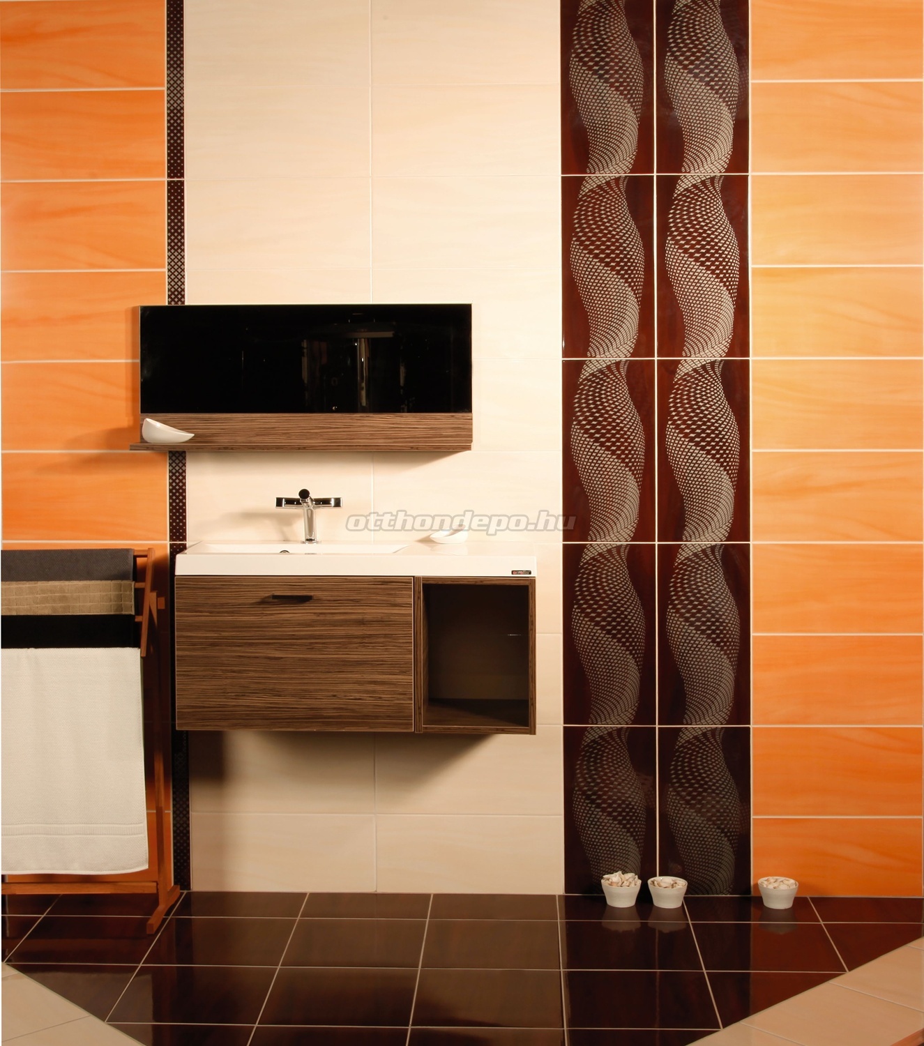Egy másik lehetséges variáció a narancssárga barnával való kombinálása. Ezzel a két meleg színnel barátságos és hívogató fürdőszobát alakíthatunk ki. Ezt a megoldást azonban kisméretű fürdő esetén inkább mellőzzük, elkerülve a túl sötét enteriőr kialakítását.