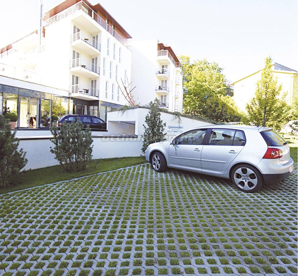 Ennél a gyepfugás térkőnél a nagyméretű távtartók által biztosított fugahézagot lehet füvesíteni, vagy zúzalékkal feltölteni. Így az utakon, behajtókon és parkolóhelyeken olyan robusztus burkolat építhető, amely kényelmes és barátságos, és megbízhatóan elszivárogtatja az esővizet.