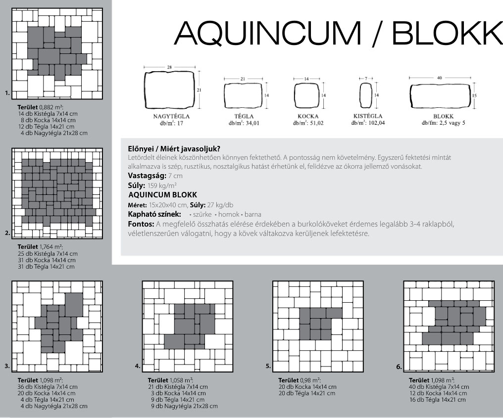 Az ókori építészet stílusjegyeit magán viselő Aquincum blokk egy romantikus időutazásra hív térben és időben. Igaz ugyan, hogy megjelenése a régmúlt időket idézi, ugyanakkor a töredezett és kopottas élek egy modern, stabil követ határolnak. Valódi antik hatása rendkívül tetszetős hangulatot kölcsönöz környezetének. A kövek minden oldala ugyanolyan felületű és mintázatú, így mind az elülső, mind a hátsó oldala használható. Ennek köszönhetően a termék bármekkora felületen megnyugtató összhangot eredményez. Az Aquincum blokk a mai kertépítés egyik alapelemévé vált, hiszen elemei lehetővé teszik a növényszigetek kiemelését a síkból. Bátran használható többek között kerti falak, talajtámfalak, kerítések és kerítésoszlopok, valamint sík kertek, teraszok, külső lépcsők építésére. Állítva paliszádként, cölöpként is használható.