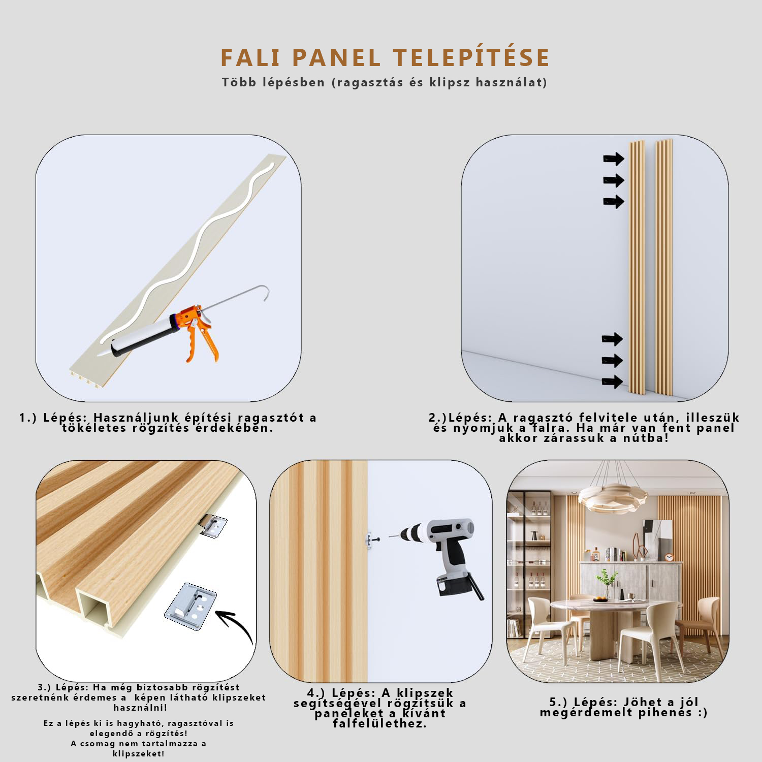 3D bordázott felületű felburkoló, gondozást nem igénylő WPC anyagból. Modern és esztétikus megjelenést kölcsönöz otthonának, iroda helységeknek. Álló -és fekvő helyzetben is könnyen és gyorsan felhelyezhető.