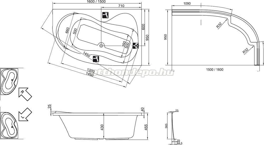 Ravak, Rosa 95 asszimetrikus kád, kádláb, le- és túlfolyó nélkül