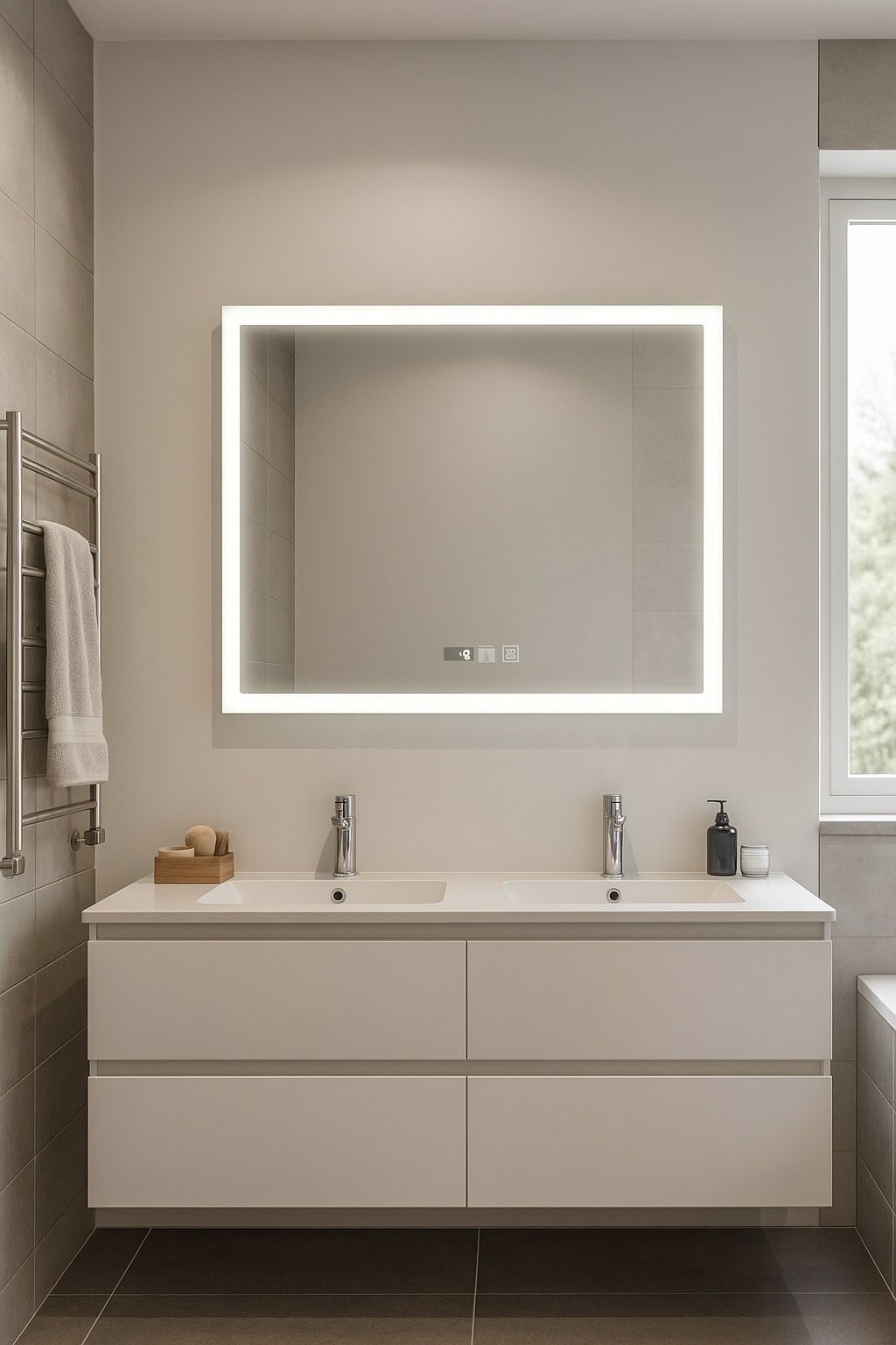 Az AD Szögletes, keretvilágítással ellátott, modern, rézmentes fürdőszobai tükör. A tükör IP67-es védelemmel ellátott, por és víz ellen. 3 színű fényerőszabályozás: Meleg fény/ Semleges fehér fény/ Hideg fehér fény, a beépített (120db lámpa / méter) gondoskodik erről. 8 mm vastag alumínium kerettel ellátott tükör.
