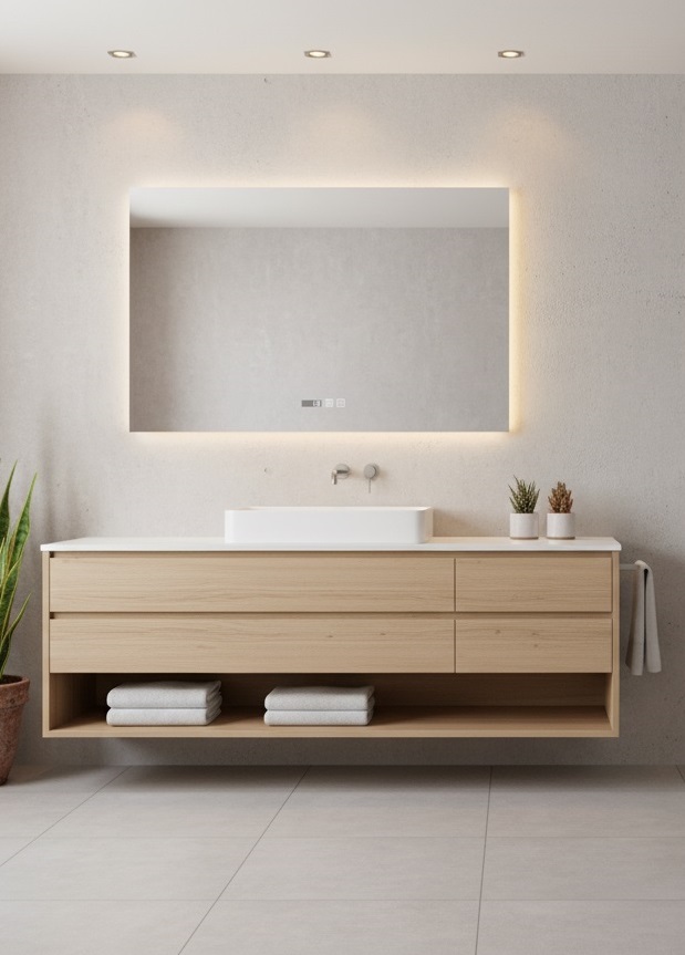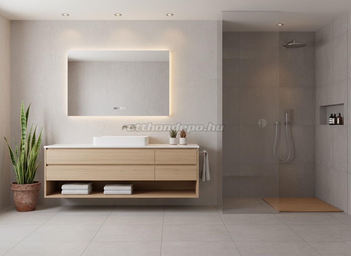 A.D. Szögletes, háttérvilágítással ellátott, modern, rézmentes fürdőszobai tükör. A tükör IP67-es védelemmel ellátott, por és víz ellen. 3 színű fényerőszabályozás: Meleg fény/ Semleges fehér fény/ Hideg fehér fény, a beépített (120db lámpa / méter) gondoskodik erről. 8 mm vastag alumínium kerettel ellátott tükör.