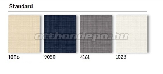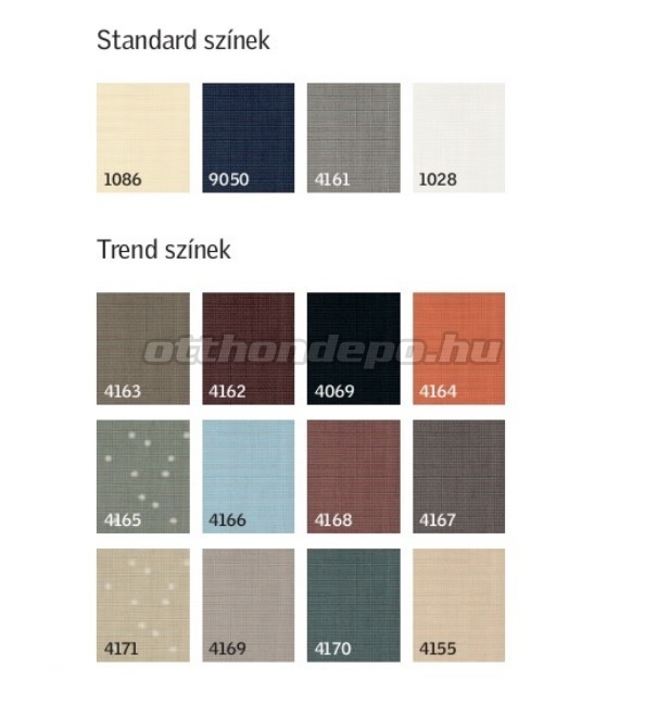 Standard színek: 1028 fehér, 1086 bézs, 4161 szürke, 9050 sötétkék / fehér vagy alumínium oldalvezető sínnel