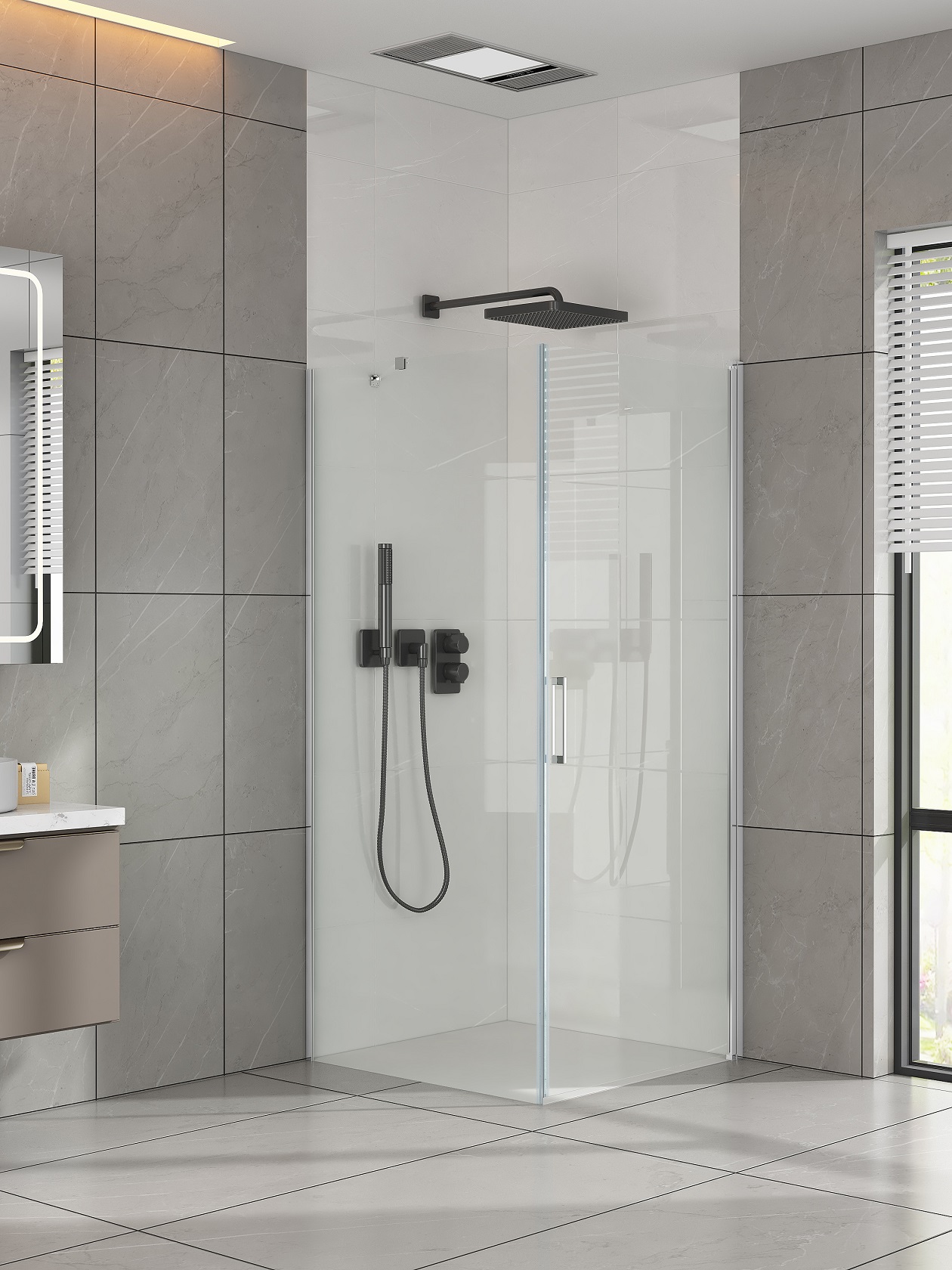 A zuhanykabin a fürdőszoba lecsempézett sarkába a RIHO Zürich zuhanytálcára vagy közvetlenül a zuhanyfolyókával vagy padlóösszefolyóval rendelkező lecsempézett padlóra telepíthető.